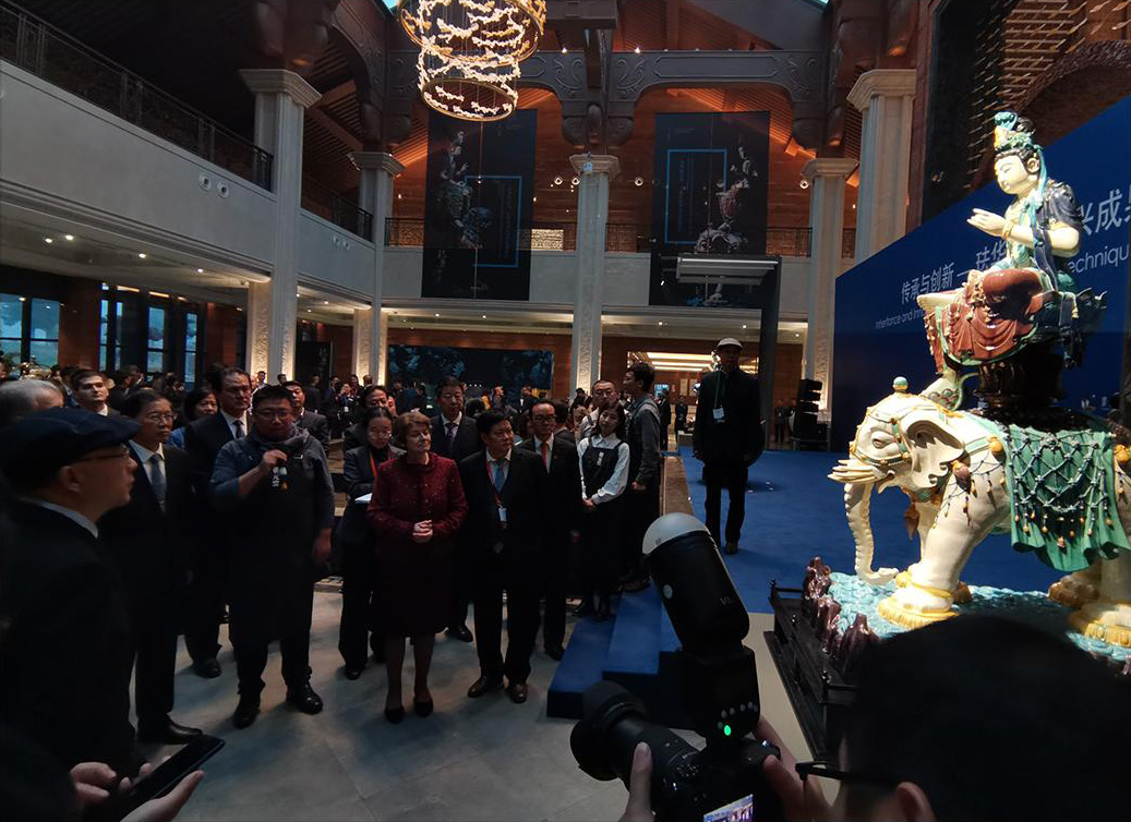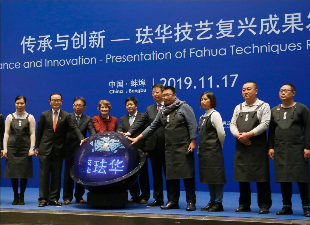 匠心绽放:珐华技艺闪耀国际舞台 Craftsmanship in Bloom: Fahua Technique Shines on the International Stage 珐华彩,是多种釉色为基调的低温彩釉陶瓷器,它传达着中国传统文化的精神特质和审美取向,饱含艺术特色和文化内涵,是世界陶瓷史上的东方瑰宝。珐华萌芽于元代,上承唐宋三彩余韵,庄严华美,釉色绚烂。在历史的长河中,珐华器物和烧造技艺经历了明代的繁华盛大,后因其烧造技艺复杂、审美观念更迭等原因,由盛及衰,至清雍正基本断烧。 Fahua ware, a low-temperature colored glazed ceramic with a rich palette of glaze colors, embodies the spiritual essence and aesthetic orientation of traditional Chinese culture. It stands as an oriental gem in the history of world ceramics, brimming with artistic charm and cultural depth. Originating in the Yuan Dynasty, Fahua inherited the grandeur and splendor of Tang and Song Tri-colored glazed pottery, showcasing magnificent and resplendent glazes. Throughout history, Fahua ceramics and their firing techniques flourished during the Ming Dynasty but gradually declined due to the complexity of the techniques and shifting aesthetic preferences, By the reign of Emperor Yongzheng in the Qing Dynasty, Fahua production had basically ceased. 如今,在于山等艺术家和匠师的努力下,古老的珐华技艺重获新生,再次焕发出夺目的光彩。珐华技艺复兴成果首次在国际平台的发布,是“朝元窑”珐华亮相2019太湖世界文化论坛“传承与创新——珐华技艺复兴成果发布”仪式,发布成果在意大利前总理罗马诺·普罗迪、日本前首相鸠山由纪夫、联合国教科文组织前总干事博科娃等嘉宾的共同见证下揭幕。 Today, thanks to the relentless efforts of artists and craftsmen like Yu Shan, the ancient Fahua technique has been reborn, radiating with renewed brilliance. The debut of the Fahua revival achievements on the international stage took place at the "Inheritance and Innovation – Fahua Technique Revival Achievement Release" ceremony at the Taihu World Cultural Forum in 2019. This historic moment was witnessed by esteemed guests including former Italian Prime Minister Romano Prodi, former Japanese Prime Minister Yukio Hatoyama, and former UNESCO Director-General Irina Bokova, among others.