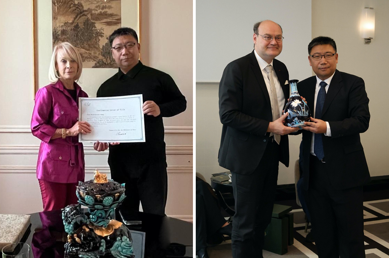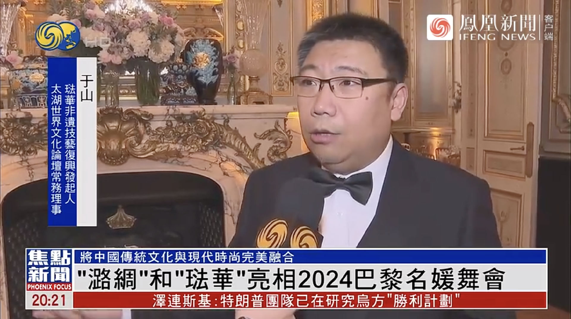 知凡文化创始人/太湖世界文化论坛常务理事于山先生,携首次海外展出的“朝元窑”珐华器接受新华网采访。 Mr. Yu Shan, the founder of ZV Design and Executive Council Member of the Taihu World Cultural Forum, received an exclusive interview with Xinhuanet with Zhao Yuan Yao Fahua wares exhibited overseasfor the first time. 原文转载:Original Report Shared: 新华网北京12月30日电(周梦鸽)日前,太湖世界文化论坛常务理事、珐华技艺复兴发起人、朝元窑创始人于山携“朝元窑”珐华器首次亮相海外,参加巴黎名媛舞会与太湖世界文化论坛“双向奔赴·中国高平非遗见面会”。这一系列亮相,不仅展现了中华优秀传统技艺的独特魅力,更将中国浪漫传递给了海外的观众,与世界共赏这一跨越时空的文化盛宴。 Xinhuanet, Beijing, December 30 (Zhou Mengge) — Recently, Mr. Yu Shan, Executive Council Member of the Taihu World Cultural Forum, Initiator of the Revival of Fahua Technique, and Founder of Zhao Yuan Yao, graced the international stage with a debut of the Fahua ceramics of "Zhao Yuan Yao" at the prestigious Le Bal des Débutantes in Paris and the "Two-Way Journey: A Meeting of Chinese Gaoping Intangible Cultural Heritage" organized by the Taihu World Cultural Forum.The recent series of showcases have not only highlighted the unique charm of China's excellent traditional craftsmanship but also made Chinese romance resonate with overseas audiences. Together, we have embarked on a journey to appreciate this cultural feast that transcends the boundaries of time and space.